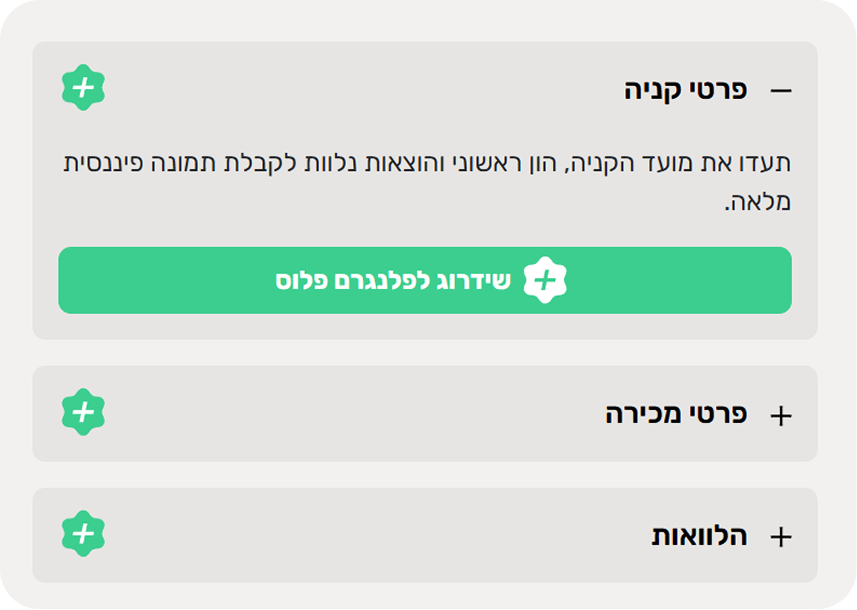 פלנגרם פלוס הוא מוצר חי שמתפתח יחד איתכם. כחברי פלוס, אתם מקבלים כרטיס כניסה לשורה הראשונה של הפיתוחים שלנו: החל מיכולת יצוא תמונת מצב פיננסית וקבלת מיילים חודשיים שישמרו אתכם תמיד עם האצבע על הדופק, ועד למנגנון שיערוך נדל"ן מתקדם המעניק לכם אומדן שווי נכסים בלחיצת כפתור. כחברי פלוס תיהנו גם מגישה בלעדית ומוקדמת לכל כלי תכנון חדש שנשיק בעתיד.