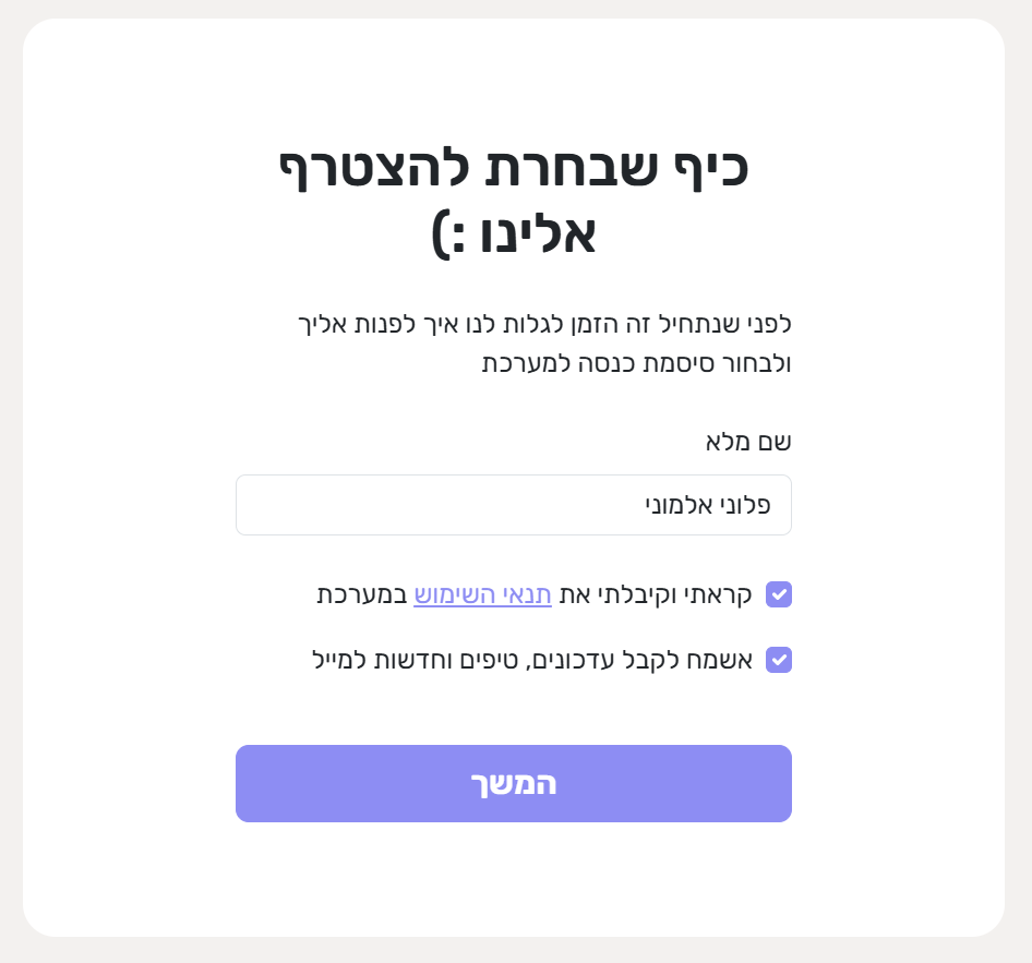 לאחר סיום הרישום, נרצה להכיר אתכם מעט כדי להכניס אתכם לעניינים מהר.