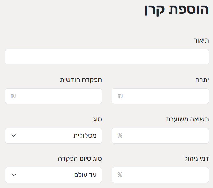 סוג - שדה בחירה שמאפשר לבחור את אופן ניהול הקרן: