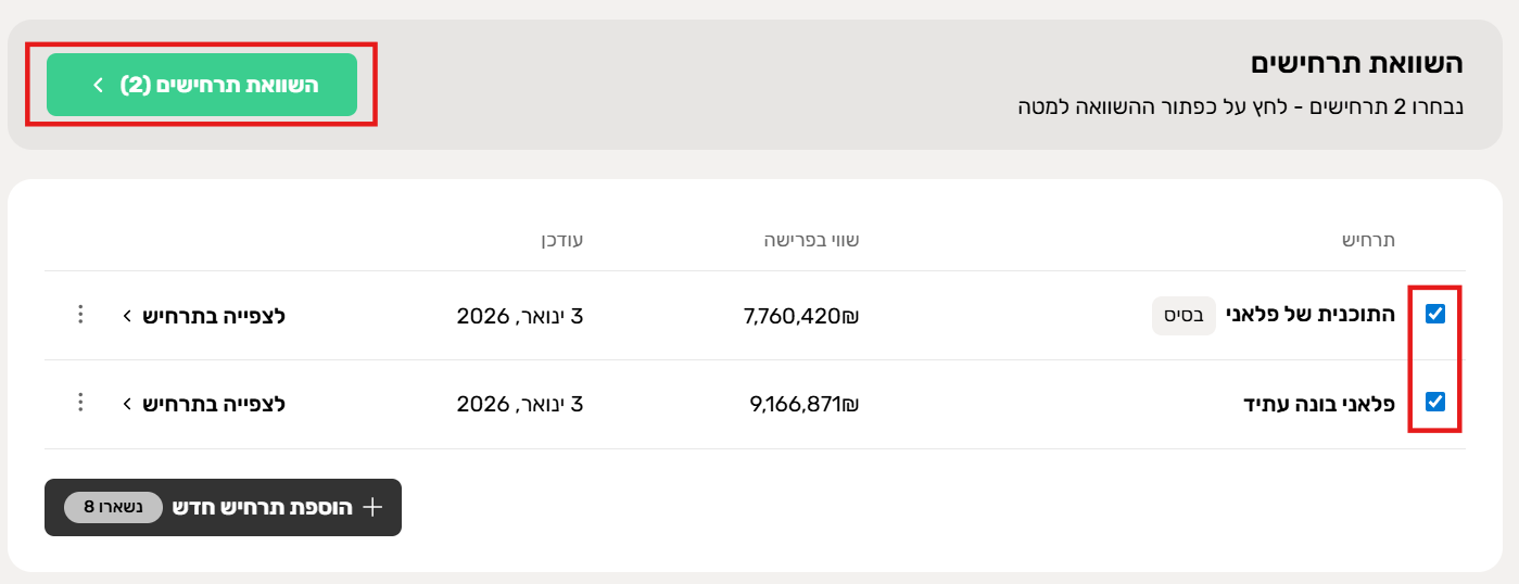 לאחר בחירת מספר תרחישים להשוואה יופיע כפתור "השוואת תרחישים" כמו בתמונה. לחצו עליו.