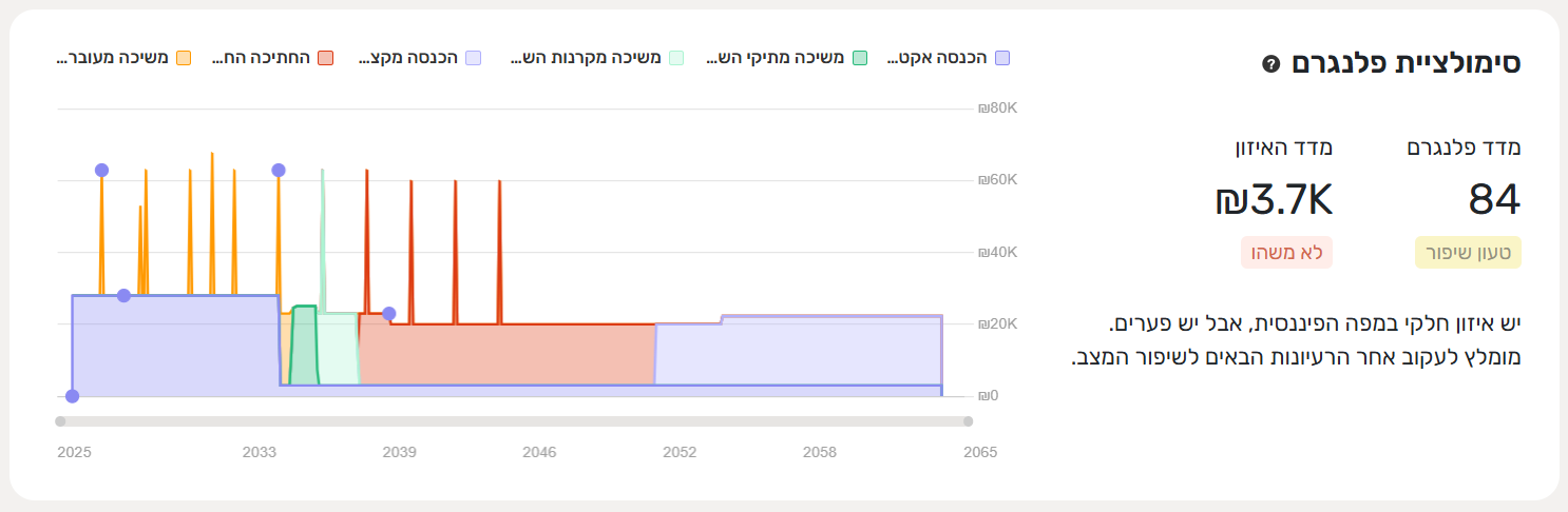 לצד גרף הפלנגרם מופיעים שני מדדים חשובים, מדד פלנגרם ומדד האיזון, שיחד מכמתים את מידת ה"איכות" של התוכנית הפיננסית שלכם: כמה איזון קיים בין ההווה לעתיד. ניתן להעמיק על מדד פלנגרם ומדד האיזון.