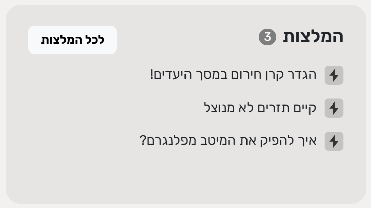 ההמלצות הן הדרך של פלנגרם לקדם אתכם אל עבר סגירת הפערים הפיננסיים שזוהו ולשיפור המצב הפיננסי. ב"מבט העל" יופיעו ההמלצות הדחופות ביותר. לחיצה על המלצה תפתח הרחבה עם דרך הפעולה המומלצת. באזור זה כפתור שמאפשר מעבר לדף ההמלצות שכולל את כל ההמלצות. פירטנו על ההמלצות של פלנגרם ואופן העבודה איתן כאן.