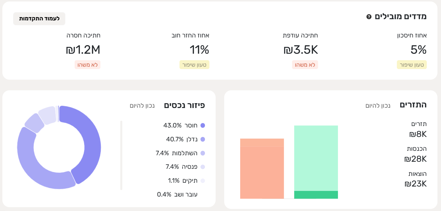 פלנגרם מאמינה בחשיבות הבקרה והניטור של המצב הפיננסי. מסיבה זו, פותחו מדדים שנותנים אינדיקציה אודות המצב עם דירוג שמסייע להבין היכן נדרש שיפור ומיקוד (להרחבה על מדדי פלנגרם). בחלק זה תמצאו את המדדים העיקריים. לחיצה על כל אחד תיתן הסבר והצעות לשיפור אם ישנן. כפתור "לעמוד התקדמות" יוביל אתכם למסך שבו תראו את כל יתר המדדים.