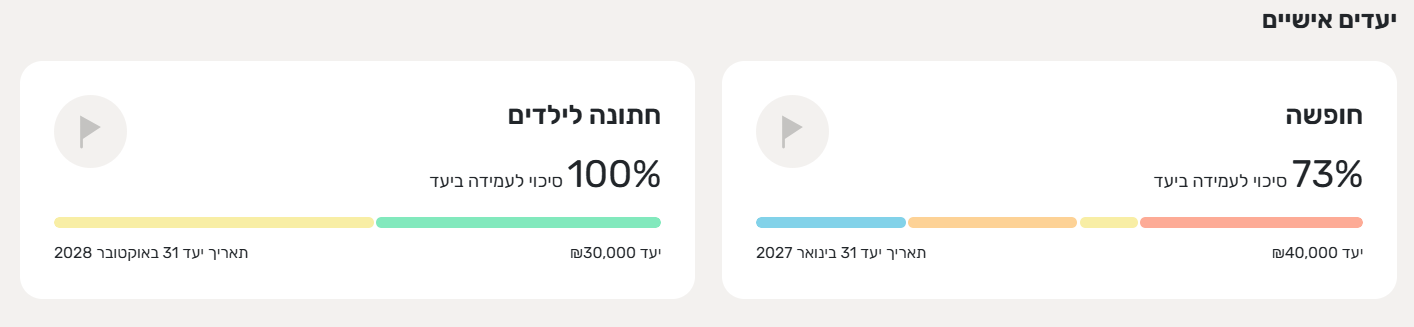 - אחוז עמידה ביעדים - אחוז העמידה שלכם בכל ההוצאות הקבועות וחד פעמיות שהגדרתם. ערך זה זהה למדד "סיכוי לעמידה ביעדים".