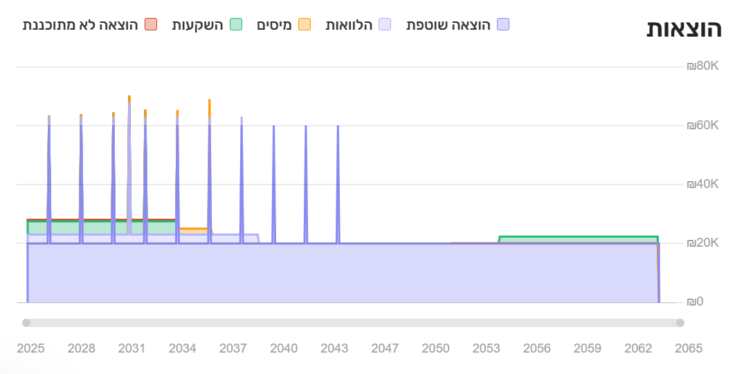 הצורה של הגרף היא בעיקר התכתיב שלכם שנובע מהההוצאות החודשיות (גם אם הן משתנות), היעדים החד פעמיים והמחזוריים (יתנו לגרף מראה של "ספייקים") ותשלומי הלוואה. עם זאת, הגרף יושפע בצורתו גם מתשלומי מיסים ומתקופות של הכנסות שהן מעל ההוצאות שיובילו להפקדה לתיקים או להפרשה לעובר ושב.