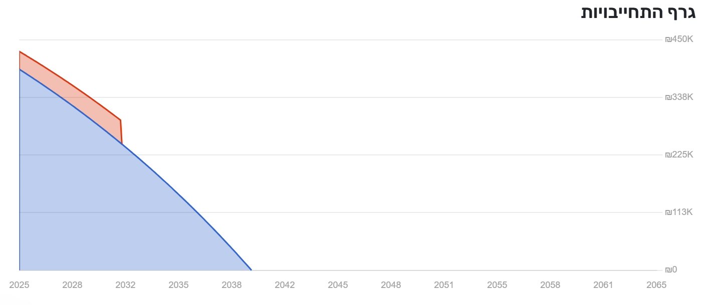 הגרף מראה השתנות בזמן של יתרת ההלוואות על סמך נתוני הריבית, מועד פירעון ותשלום חודשי שהוזנו.
